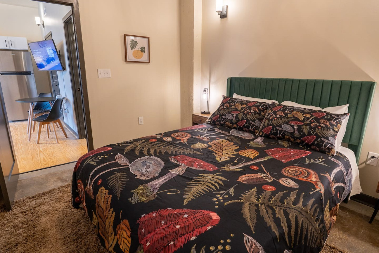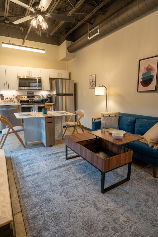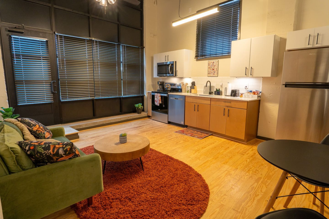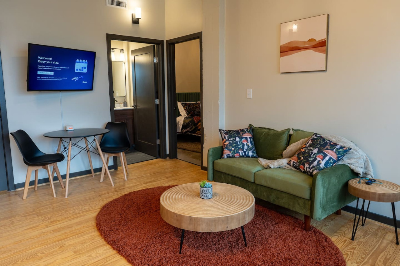 / nightExperience spacious comfort in our unique combined unit located in historic Uptown Martinsville, Virginia. This ground-floor rental merges two adjacent 1-bedroom apartments into one expansive space, perfect for families or groups seeking extra room. Each apartment features a full kitchen with new appliances, modern furnishings, and a cozy living area equipped with fast fiber internet and streaming TVs in both the living rooms and bedrooms. Rest easy on comfy queen memory foam beds after a day of exploring. Situated in a safe, walkable neighborhood, you're just steps away from charming shops, local eateries, and cultural attractions. Enjoy the convenience of free on-site parking and easy ground-floor access. This combined unit offers the perfect blend of modern amenities and historic charm, ensuring a comfortable and memorable stay in Uptown Martinsville.